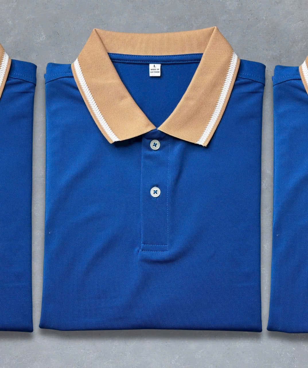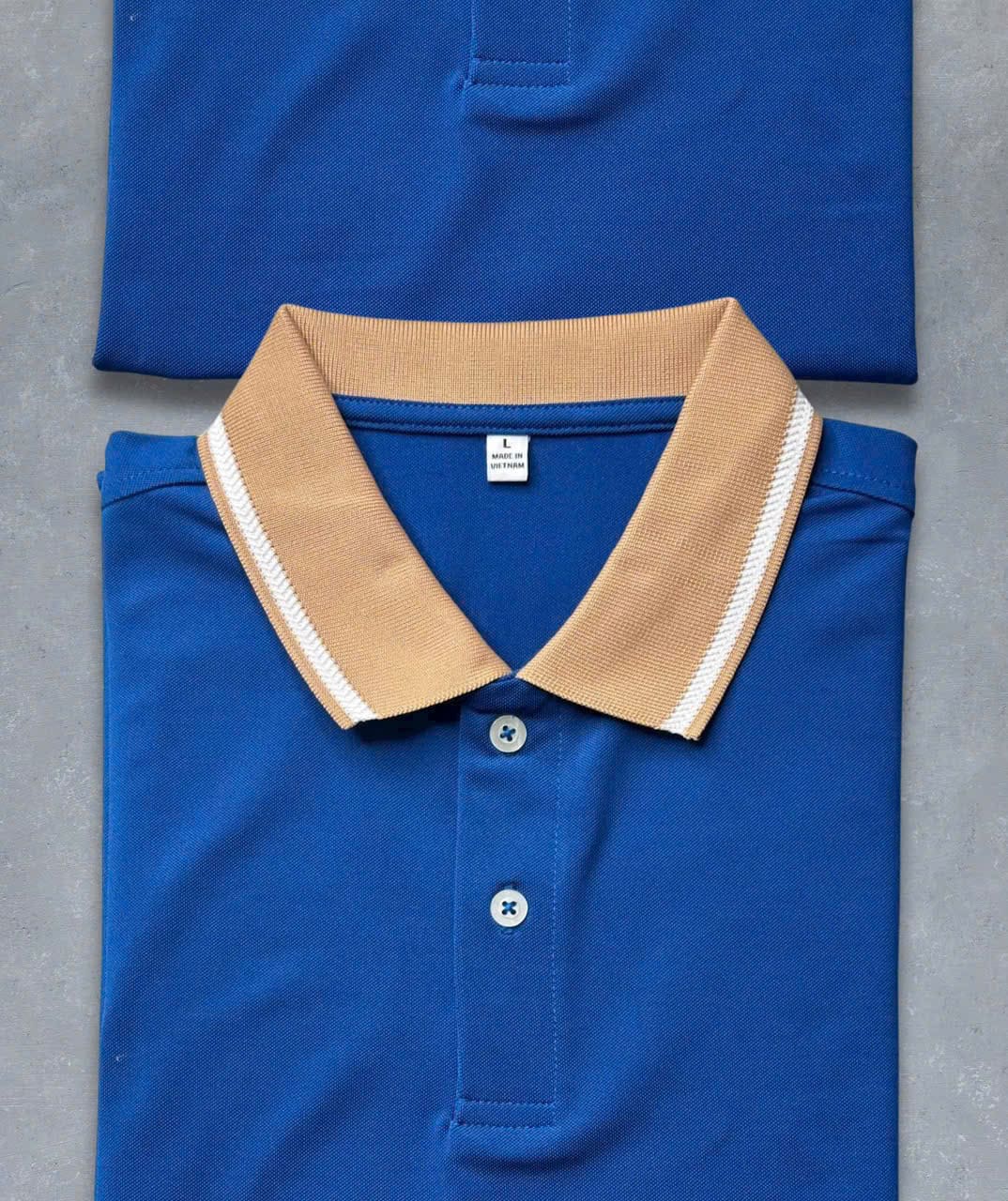 Mẫu áo A02-275 sở hữu tông màu xanh dương chủ đạo (Royal Blue) mang lại cảm giác tin cậy và năng động. Điểm nhấn đặc biệt nằm ở phần cổ áo và bo tay màu Beige (vàng cát) có viền trắng, tạo nên sự tương phản nhẹ nhàng nhưng vô cùng sang trọng, phù hợp cho cả môi trường công sở lẫn các hoạt động sự kiện ngoài trời.